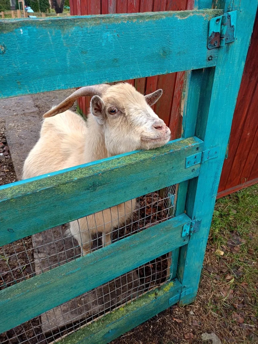 В завершении экскурсии мы угостили любимца детей козлика Персика свежими яблоками.